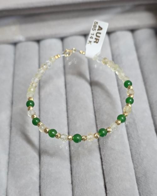 brățara realizată manual din elemente din aur 585 și combinatie din pietre semipretioase jad verde și citrin.18,5cm.