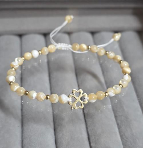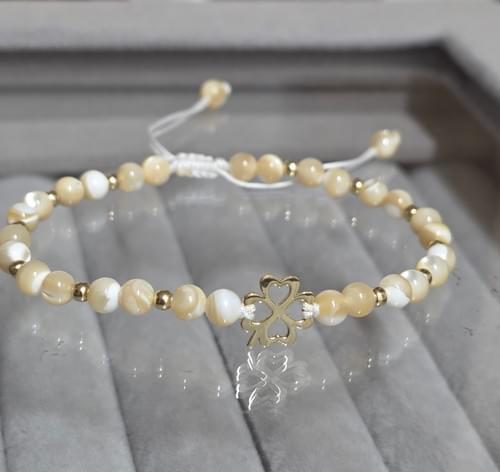 Brățara pe șnur realizată din elemente din aur 585 și pietre semipretioase sidef.