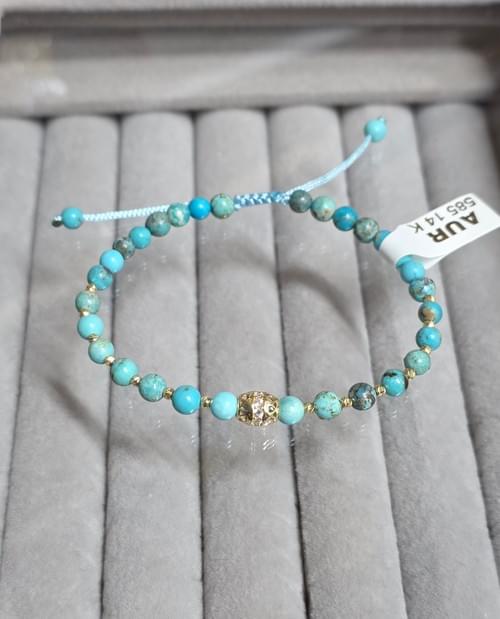 Brățara reglabilă lucrata manual din elemente din aur 585 și piatra semiprețioasă turcoaz natural 4mm.O brățara în culori vii care va binedispune!Un cadou deosebit pentru orice ocazie!