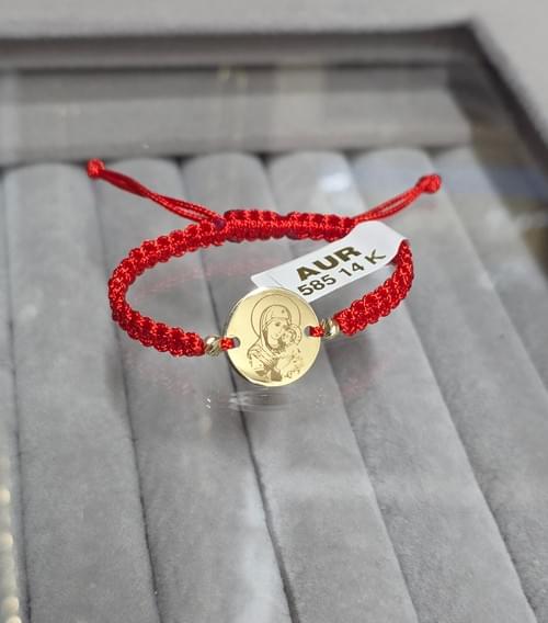 Brățara realizată manual din șnur și bănuț din aur 585 gravat cu iconiță.