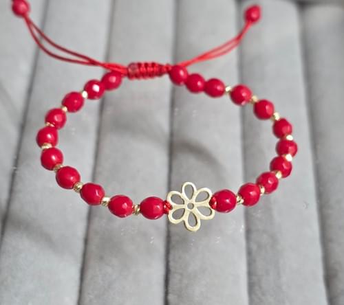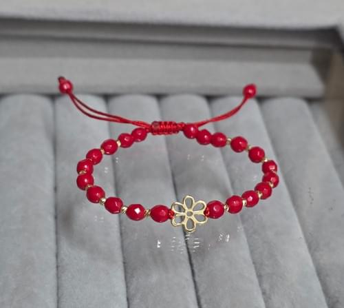 Brățara realizată din elemente din aur 585 și pietre semipretioase,jad roșu.Acest model se poate realiza atât pentru Adulți cât și pentru copii.