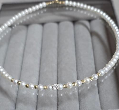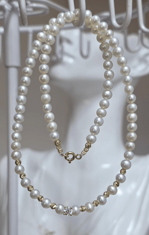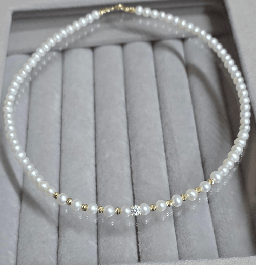 Acest Colier este realizat din perle naturale de cultura de 4mm, calitate superioara și elemente din aur 585 insirate pe un fir transparent și durabil, oferind confort și flexibilitate pentru purtarea zilnică.